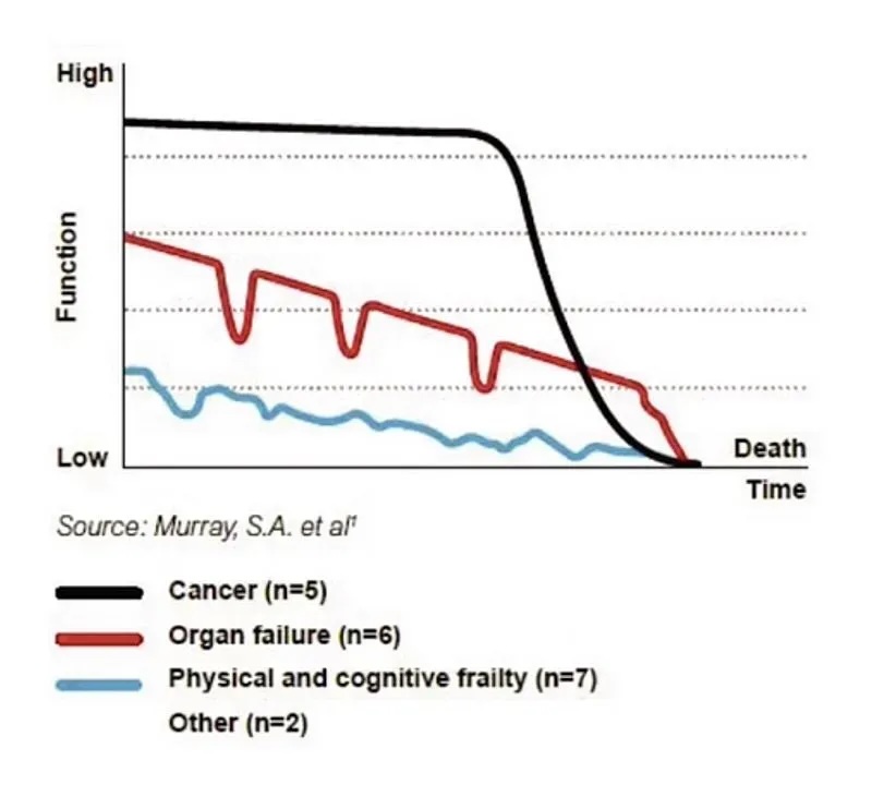 While not every pet follows the same path in decline, this graph depicts common end of life decline trajectories for those pets dealing with cancer, organ failure, or simply comorbidities that go along with old age, and can help inform and prepare us to support them.